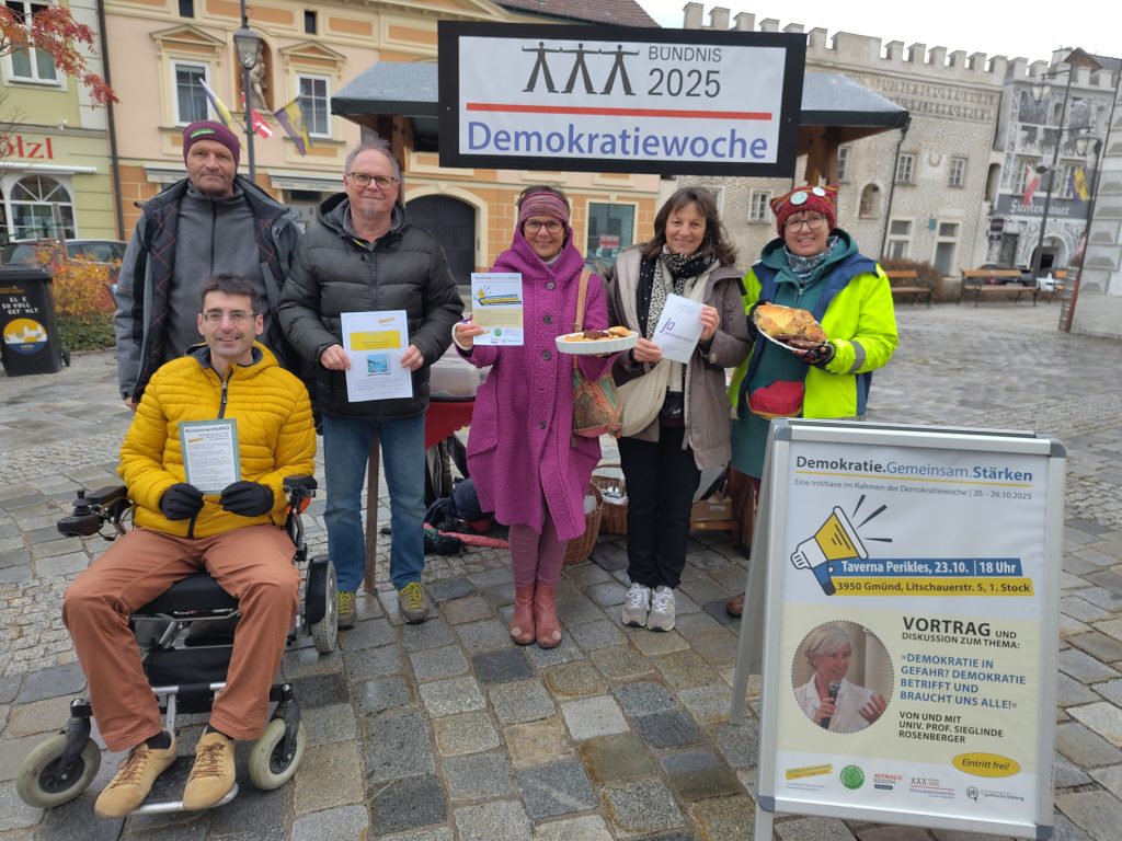 Mit Infostand, Flyern der unterschiedlichen Demokratie-Initiativen und ganz viel Kuchen starten wir die Demokratiewoche 2025 in Gmünd am Stadtplatz.