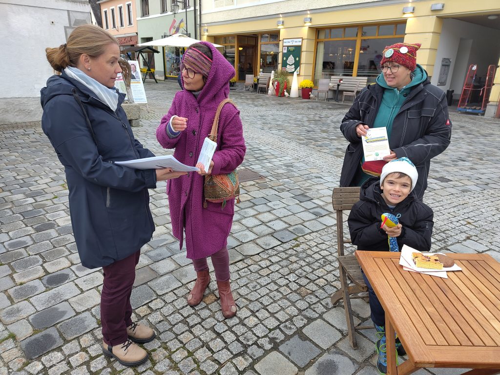 An diesem kalten, regennassen Oktobertag ist der Stadtplatz trotz Bauernmarkt nur spärlich besucht. Wir gehen auf ersten Passant:innen zu, laden sie zu einem Stück Kuchen ein und sie teilen unsere Meinung, dass Demokratie wichtig sei. Gerade ältere Personen erzählen, dass sie sich Sorgen machen und hoffen, dass es für ihre Enkel gut weitergehe.